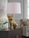 This charming table lamp brings a touch of playful sophistication to your home. An adorable French bulldog base, finished in a sleek goldtone, is sure to be a conversation starter. This lamp's warm and inviting ambiance makes it a delightful addition to your bedside table or living space decor.