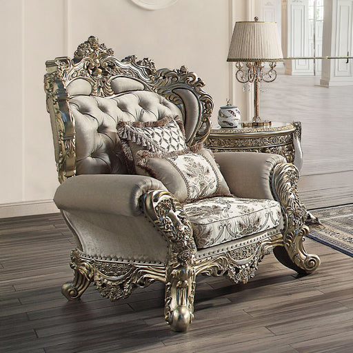ACMEDaesha - Chair With Pillow - Tan Flannel & Antique GoldProduct Features Assembled, w/1 Pillow (French Provincial Chair) Carved Molding with Nai...