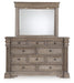 | Details | B916B4: Includes panel headboard, footboard with slats and rails, Made with hardwood solids, oak and ash veneer, cast resin components and engineered wood substrates, Tops with inlaid ash veneer border, Light warm grayish brown glazed wood finish, Breakfront pilasters, Inset picture frame panels, Headboard features light bridge with 2 overhead LED lights, Foundation/box spring required, sold separately , Mattress available, sold separately, Assembly required, B916B1: Includes dresser and mirror, Made with hardwood solids, oak and ash veneer, cast resin components and engineered wood substrates, Tops with inlaid ash veneer border, Light warm grayish brown glazed wood finish, Round metal knobs with satin nickel-tone finish, 10 drawers with fully finished interior, dovetail construction and ball-bearing side glides, Drawers with inset framed fronts, Dresser with breakfront pilasters, Mirror frame features light bridge with 2 mini LED lights, Mirror attaches to back of dresser, B916-93: Made with hardwood solids, oak and ash veneer, cast resin components and engineered wood substrates, Top with inlaid ash veneer border, Light warm grayish brown glazed wood finish, Round metal knobs with satin nickel-tone finish, 3 drawers with fully finished interior, dovetail construction and ball-bearing side glides, Drawers with inset framed fronts, Breakfront pilasters, 110V power supply with dual USB charging ports, Power cord included; UL Listed, | |