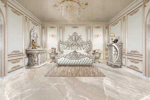 ACMEA luxurious antique silver finish with hand-brushed gold accents makes up the Sandoval bed. It is surrounded by fine Rococo scrolls and floral orna...