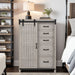 The Alexandria Wardrobe Chest from Bridgevine Home delivers a Modern Farmhouse-Industrial-Rustic style trifecta. Skillfully crafted from Poplar Solids and Birch Veneers, this Chest is finished in Mountain Mist with Forged Iron rivets and hardware. Featuring five drawers and one sliding barn door, this chest will provide ample storage for clothing and jewelry and make a stylish addition to your main or spare bedroom. Fully Assembled upon arrival, this piece from Bridgevine Home is ready to unbox and enjoy.