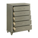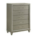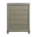 Meet the Lumina Chest, a testament to durability and style. Crafted from solid Rubberwood and manufactured wood, this chest boasts a robust construction, covered with eco-friendly decorative laminate for added strength and stability. Its high gloss gray finish adds a touch of glamour, complemented by embossed silver laminate drawer fronts and clear acrylic drawer pulls. But beauty is not just skin deep; inside, you'll find drawers built with English dovetail joinery, finished interiors, and full-extension drawer glides, ensuring smooth and long-lasting operation. With five roomy drawers, this chest offers ample space for all your clothing storage needs. Experience the perfect blend of elegance and functionality with the Lumina Chest.