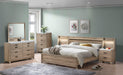 This bedroom collection brings a breath of fresh air to any interior with its light, natural wood finish that evokes a sense of calm and simplicity. The well-crafted bed frame, with its clean lines and subtle headboard design, provides a modern rustic charm that's both understated and inviting. Stylish night stands with integrated lighting backs flank the bed, creating a wall bed effect. Faux stone tops accent the storage pieces for extra luxury.