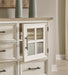 Details Made with hardwood solids, veneers and MDF substrates, Two-tone finish (antiqued white and light gray wood tone), Dark rustic bar pulls, 2 glass-front cabinets, each with adjustable shelf, Door includes interchangeable wood veneer panel (ships with glass panel installed), 5 drawers with fully finished interior, dovetail construction and heavy duty ball-bearing side glides (top drawer felt lined)