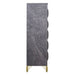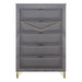 - Glimmering Glamour: Trendsetting gold metal and mylar accents dazzle against the ultra-soft gray fabric drawer fronts, while intricate detailing adds a touch of sophistication to the elegantly designed legs.