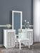 | Details | Includes vanity and mirror, Made with solid wood components, MDF substrate and decorative PVC laminate, Bright white lacquer finish, Vertical metal drawer pulls, Built-in LED lighting with 3-way dimmer switch, 3 drawers with fully finished interiors, English dovetail construction and heavy-duty ball-bearing side glides, Drawers with rhinestone frames; textured laminate drawer fronts, 110V power supply with USB-A and USB-C charging ports, Power cord included; UL Listed, Mirror with rhinestone frame; attaches to back of dresser | |