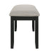 This dining group is the epitome of modern sophistication and functional elegance. The centerpiece is a sleek, rectangular table with a beautifully textured wood grain finish, offering a touch of rustic charm to its contemporary design. The table is complemented by a set of four ladder-back chairs and a versatile bench, all featuring a deep black frame that provides a striking contrast to the neutral, upholstered seats. The cushioned seating ensures comfort, while the bench adds flexibility and a communal feel, perfect for both family meals and entertaining guests. The overall design is enhanced by clean lines and a minimalist aesthetic, making this set a stylish focal point for any dining space.