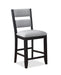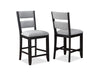 Bring a fresh look to your dining space with this breezy counter height group. The table has an array of design features, including drawers, bottle storage, and an open bottom shelf. Ladderback chairs and bench are upholstered in a Chevron pattern fabric with piping detail.