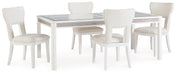 Embracing modern glamour, this dining room ensemble is a sparkling addition to your dining area. A bright white lacquer finish, shimmering rhinestone accents and clear glass panels give the extension table plenty of polish. Upholstered side chairs wow with metallic thread accents and a look all their own.