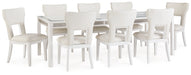 | Details | D822-35: Made with solid wood components, MDF substrate and decorative PVC laminate, Bright white lacquer finish, Tabletops feature rhinestone and textured PVC framing with glass panels, Rhinestone accent trim, Seats up to 10, Removable center leaf, Table extends by pulling both ends and dropping in leaf, Assembly required, D822-01: Made with solid wood frame, Bright white lacquer finish, Polyester upholstery, Foam cushion, Legs with adjustable levelers, Assembly required, | |