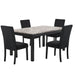 The Celeste Dining Set is a picture of modern luxury and enduring craftsmanship. This set includes a striking 64-inch dining table with an espresso base and a faux marble top, accompanied by four exquisite velvet chairs. Crafted from solid Rubberwood and manufactured wood components, the dining set is designed for longevity, ensuring a timeless addition to your dining space. The glossy finish on the tabletop provides heat and water resistance, ensuring easy cleaning and protection from wear. The white and gray veined faux marble top, set against deep espresso legs, creates a contemporary and glamorous ambiance. Luxurious seating awaits with the soft and durable 100% polyester velvet fabric covering sumptuous memory foam cushions, offering both comfort and easy maintenance. Tailored for elegance, the rich and luxurious colors of the velvet chairs are enhanced by silver nailhead trim, providing a sparkling final touch to this impeccable dining set. Enjoy the fusion of contemporary glamour and enduring quality with the Celeste dining collection.