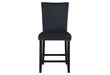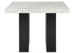 Black Faux marble counter table design with an extra thick top and a double pedestal base with silver connectors. The chairs have nail head trim tat accent the seat and back. The leg color matches the table base.