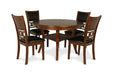 The elegant Gia 5 Piece Dining Table and Chair Set is built with durability and comfort in mind. This dining set provides spacious seating for four, and a handy storage shelf located under the table top to store dinnerware or decor. The dining table apron, table legs and dining chair legs are crafted of solid Rubberwood to add strength and stability. The distinctive reverse diamond Mindi wood veneer dining table top accents the beautiful wood grains which are highlighted by the multi-step finish, with just a touch of red for richness. The set includes four comfortable dining chairs with pu upholstered seat cushions and backrests. The final touch is Gia's signature interlocking chain design on the chair back, giving this welcoming dining set a touch of sophistication. The result is a casual, contemporary dining set, perfect for your dining room or kitchen.