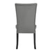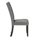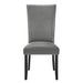 Upgrade your dining area with the Lyra Upholstered Dining Chairs. This set of two chairs feature a sleek gray upholstery that exudes contemporary glam, complemented by black legs and elegant silver nail head trim. Crafted from a combination of solid and manufactured woods, these chairs offer stability and durability. The fully upholstered backs and seat cushions are filled with supportive foam, ensuring a comfortable seating experience for you and your guests. Add a touch of sophistication and comfort to your dining space with the Lyra Upholstered Dining Chairs.