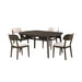 The Rex Mid-Century Modern Wood Dining Set offers a stylish and functional solution for your dining area. This set includes a 65" round dining table with self-storing leaves and chairs. Crafted from solid rubberwood, manufactured woods, and oak veneers, it ensures exceptional stability and longevity. The classic mid-century modern design features a minimalist aesthetic with clean lines, rounded edges, and angled, tapered legs, capturing the timeless elegance of the era. The multi-step finish, hand-rubbed with a clear topcoat, enhances the natural beauty of the wood grain. The chairs provide comfortable seating with softly rounded backrests and resilient foam seat cushions wrapped in 100% easy-care polyester fabric. The innovative round dining table extends with self-storing leaves to provide seating for six, making it perfect for both everyday meals and special occasions. This dining set combines quality construction, classic design, and practical functionality, making it a great addition to any home.