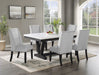 A fresh take on a traditional silhouette makes this group a great addition to your dining space. A faux marble top provides an elegant look while being easy to care for. The trestle base is updated in a contemporary charcoal finish. The upholstered dining chairs feature gently sloped wings and a nail head trim on the back. Button tufting accents the dining bench.