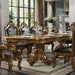 Acme's exclusive Picardy collection now includes this magnificent double pedestal dining set in honey oak finish! Each supporting pedestal is intricately carved, and ends in four oversized scrolled legs. The rectangular wooden top features a parquet look veneer, and can adjust for large gatherings with two extension leaves. The matching side and arm chairs also feature elaborate scrolled floral motifs on the arched backrests and Queen Anne style front legs. Luxurious details, such as button tufting on the chairs' outside backrests and nailhead trim along the PU padded seat and back, heightens the opulent feel of this collection. This dining set is also available in other finishes and sizes to best suit your lifestyle. Our exclusive Picardy collection also includes matching bedroom pieces, so you can create the gorgeously appointed home of your dreams.