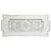 Sophisticated luxury radiates beautifully in the Vanaheim Dining Room Collection. Fabulous floral design with gorgeous details in each piece makes the collection classical and timeless. Antique white finish gives the surface an alluring feel and elegant touch. A clear glass dining table top allows light to filter into and through the whole table, enhancing the collection's overall design. Upholstery side chairs feature elaborate button-tufted design for adding extra style and comfort to the collection. This extremely extravagant style will make any ordinary dining room appear much more unique.