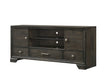 This entertainment console offers a sleek and stylish update to any space, featuring a rich, dark finish that commands attention while maintaining a sense of warmth and coziness. 2 sliding doors provide access to hidden and open shelving while lower drawers offer even more storage. Cable management holes help keep cords tidy and out of the way.