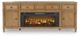 | Details | Made with hardwood solids, hickory wood veneer and MDF substrate, Light brown wood-tone finish, Dark bronze-tone drawer pulls, 2 cabinets, each with an adjustable shelf, 4 smooth-gliding drawers , Cutouts for wire management , Electric fireplace insert provides up to 5,386 BTU/1,500W and warms up to 1,000 square feet, 6-level temperature setting; overheating control device, 5 levels of flame brightness; LED-lit flame operates with or without infrared heat, Realistic-looking log set with dynamic glowing embers; ambient down light with on/off function, Built-in audio speakers with wireless connectivity; touch button controls and remote control; timer function with programmable ranges from 10 minutes to 9 hours, Power cord included; UL Listed, Assembly required; simply remove the center shelf and back panel to make room for the fireplace insert | |