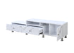 Embrace modern sophistication and functionality with this stunning entertainment console, designed to be the centerpiece of any contemporary living space. Featuring a sleek white finish with elegant faux marble accents, this piece combines luxury and practicality. The robust construction ensures durability while providing ample storage for all your media needs. It offers generous shelving spaces and smooth-gliding drawers accented with chic, minimalist handles. Elevated on stylish, silver-tone legs, this console not only enhances the visual space of your room but also keeps your entertainment area tidy and stylish.