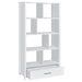 Asymmetrical shelves stack against one another to create this stunning, contemporary bookcase. A stylish, eye-catching addition to a home office, this minimalist bookcase invites you to organize office accessories or showcase decor and family photos. Eight separate sections divide items categorically if you wish, while a bottom drawer keeps items out of sight. The single drawer is adorned with a sleek, brushed zinc pull that further lends to the chic nature of this bookshelf. Versatile and functional, place this tall bookcase in the room of your choosing.