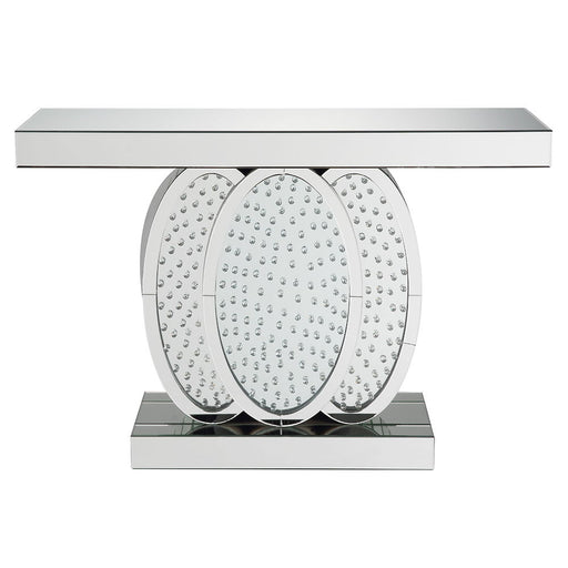 CoasterElevationsThis mirrored console table features an elegant design with a rectangular top and bold, oval-shaped bases. The base is adorned with acrylic crystal...