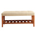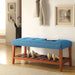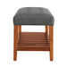 Simplistic lines pulling from the craftsman era and tapered legs to add some style, the Charla bench with button tufted full box seat can easily compliment any home styling Decor. The added width of the bottom slats serves as a function shelf. There are 4 fabric colors offered: Light gray, beige, blue, and gray.