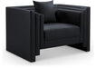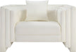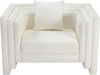 Soft tan vegan leather and a bold, structured silhouette give the Everett chair a modern edge. Cushioned with plush pillows and built with a solid wood inner frame, it's designed for both style and comfort. Perfect for elevating any room, this chair creates a striking focal point while inviting you to sit back and relax.