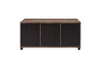 The rustic wooden frame and industrial metal accent complement each other perfectly. The coffee table embodies a raw, utilitarian aesthetic that adds a strong design presence to the space. Two sliding barn doors with obscure glass insert offer both privacy and style. A storage compartment behind each barn door frees up tabletop space. Between two doors is an open storage compartment with a pull-out tray for remotes, nail clipper, or other odds and ends that you want easy access to.