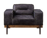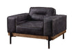 Part of the handsome Silchester Collection, this modern industrial chair will look great in any contemporary space. Contrast stitching makes the antique ebony top grain leather upholstery pop, and highlights the warm color of the wooden trim base. Metal spindle legs visually lighten the substantial proportions of this sofa set. Enjoy wide track arms and comfortable feather and foam seat construction, and relax in style.