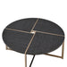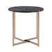 Round, fashionable, and practical. The Bromia end table is a convenient way to add a bit of flair to your home. It is expertly designed with a champagne-colored metal frame, and a black wooden tabletop that ensures it will match any decor style. The tabletop also features a fun metal design to elevate the style.