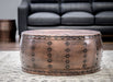 Eastern influences dominate with the addition of the Cooper round cocktail table. Iron with a gleaming hammered copper painted finish with Rivet accents will take you and your guests on a journey to a distant land. Also available is the coordinating end table.