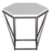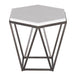 - Styling details include architectural hexagonal top with metal base with suspended base make the tables an interesting addition to any room
