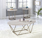 Get an immediate upgrade to your living room with the Rowyn 3-Pack Table set that is a Living Room in a box with a Cocktail Table and Two End Tables included. This contemporary styled collection features a faux white marble top that delivers the look of real marble at a true value price. The scratch-resistant top sits on a beautiful copper-colored hexagonal metal base for a crisp modern look.