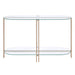 This Veises chic sofa table is the perfect addition to your living room, bedroom, or den, and it's the ideal way to showcase your favorite books, photos, and knick-knacks. The oval shape of the clear glass tabletop gives it a unique accent that is unlike anything you've seen before. With gold metal legs and an open frame design, this piece really shines!