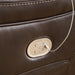 Load up on comfort in a cool, clean-lined and contemporary way with this power reclining sofa in chocolate brown. Rest assured, the expertly matched leather and faux leather upholstery is enriched with a pebble grain effect for authentic appeal and enhanced with jumbo stitching for dramatic contrast. It features a one-touch power control with adjustable positions, along with an Easy View™ adjustable headrest that allows a primo view of the TV even when you're reclined. Extended ottomans provide extra length for leg comfort. A zero-draw USB plug-in at your fingertips lets you charge up as you chill out.