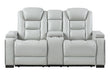 The U8609 Power Console Loveseat blends comfort and convenience in a sleek design. Upholstered in soft blanche silver, it includes dual power reclining and power headrests, plus a center console with storage and cupholders. With USB ports on the power switch, LED-lit side storage, hidden arm compartments, and studded arm accents, this loveseat is the perfect combination of luxury and practicality.