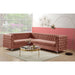 Frankly, the Rhett sectional sofa is simply stunning. Vibrant velvet upholstery pops against a boxy silhouette. Button tufting extends around the inside and outside of high shelter armrests as well as the both sides of the tight seatback. Metal bracket legs and nailhead trim add some shine to of this L-shape sectional.