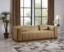 A minimalist masterpiece, the Mallina tan vegan leather sofa combines form and function for a modern and stylish look. Its classic design and rich leather upholstery make it a sophisticated statement piece that will never go out of style. The clean lines, paired with a brown walnut finished base, create a sophisticated and inviting atmosphere.