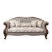 A new addition to Acme's collection of exclusive designs, the Miyeon sofa set in cherry finish is full of handsome details. Nailhead trim along the padded seat base runs up the scrolled arms and arched seatbacks. Button tufting on the seatbacks makes the fabric upholstery look especially cozy. Raised floral motifs embellish the Queen Anne legs on each piece of this set, including matching occasional tables.