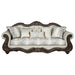 Pierce collection sofa set brings timeless elegance to your living space with its beige fabric and cherry finish. The set includes tight back and loose seat cushions with pocket coil construction for ultimate comfort. A wooden inner frame ensures durability, while button tufting and floral trim apron and legs add a touch of sophistication. Complete with accent pillows and a matching wooden tabletop, this set perfectly blends classic charm with modern comfort.