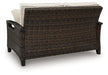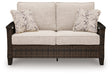 Looking for that special spot to relax and entertain on your deck or patio? Then you'll love the Drakes Beach outdoor loveseat. With beautifully textured resin wicker over a sturdy aluminum frame, it brings so much style and warmth to your outdoor space. The thick, comfortable cushions are covered in cleanable, UV-resistant Nuvella® fabric, so you can spend less time worrying and more time chilling. What a smart and stylish way to create a beautiful, lasting space for everyone to enjoy.