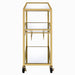 With its shimmering tiers, this Adamsen serving cart will catch the light for a stylish sparkle to complement neutral spaces. The clean-lined design crafted of a gold finish, a mirrored top, and bottom shelf, two center shelves with different heights to display various decor. This cart also comes equipped with wine and glass rack for your favorite bottles.