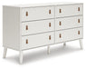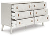 Dare to take minimalism to the max. This dresser has an air of sleek simplicity thanks to its white painted finish with subtle replicated wood grain. The magnificently mod splay legs are a compelling complement to its streamlined design. And with two sets of faux leather drawer pulls that allow you to customize the dresser to suit your space, there's no doubt about it: This contemporary piece is sure to become a classic.