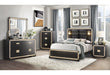 The Blake collection combines style and elegance with many beautiful features. The collection is outlined with gold colored crushed crystal to highlight its unique design. The Bed has a tall headboard and two lights along with quilted padding. The lights add style, design and function which can be used as reading lights. The quilted padding complements the design and adds comfort. All the other pieces have the black finish and crushed gold crystal outline complemented by the black and gold hardware.