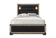 The Blake collection combines style and elegance with many beautiful features. The collection is outlined with gold colored crushed crystal to highlight its unique design. The Bed has a tall headboard and two lights along with quilted padding. The lights add style, design and function which can be used as reading lights. The quilted padding complements the design and adds comfort. All the other pieces have the black finish and crushed gold crystal outline complemented by the black and gold hardware.