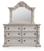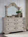 Details Includes dresser and mirror, Dresser made with hardwood solids, oak and ash swirl veneers, MDF substrates and cast resin components, Mirror made with solid wood, Antiqued white finish, Hardware with antiqued bronze-tone finish, 6 smooth-gliding drawers with fully finished interiors, English dovetail construction and heavy-duty ball-bearing side glides (top drawers felt lined), Mirror attaches to back of dresser