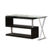 The Buck desk is loaded with features of use and function. Not only does it have the capability of being set up for left or right configuration, it boasts a offset designed corner end with 3 display surfaces and can be seen from any view with the main desk top being glass surface. The end support leg is tastefully designed using round rod piercing a rectangular metal leg. The desk is also offered in black or white.