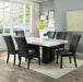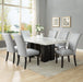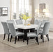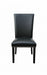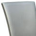 Elegant dining with a modern twist, the Camila dining chairs are available in black or silver faux leather or an upscale blue velvet material. The chairs feature sturdy, solid wood construction and are accented by stylish silver nail head trim and feature a curved back for comfort and support.